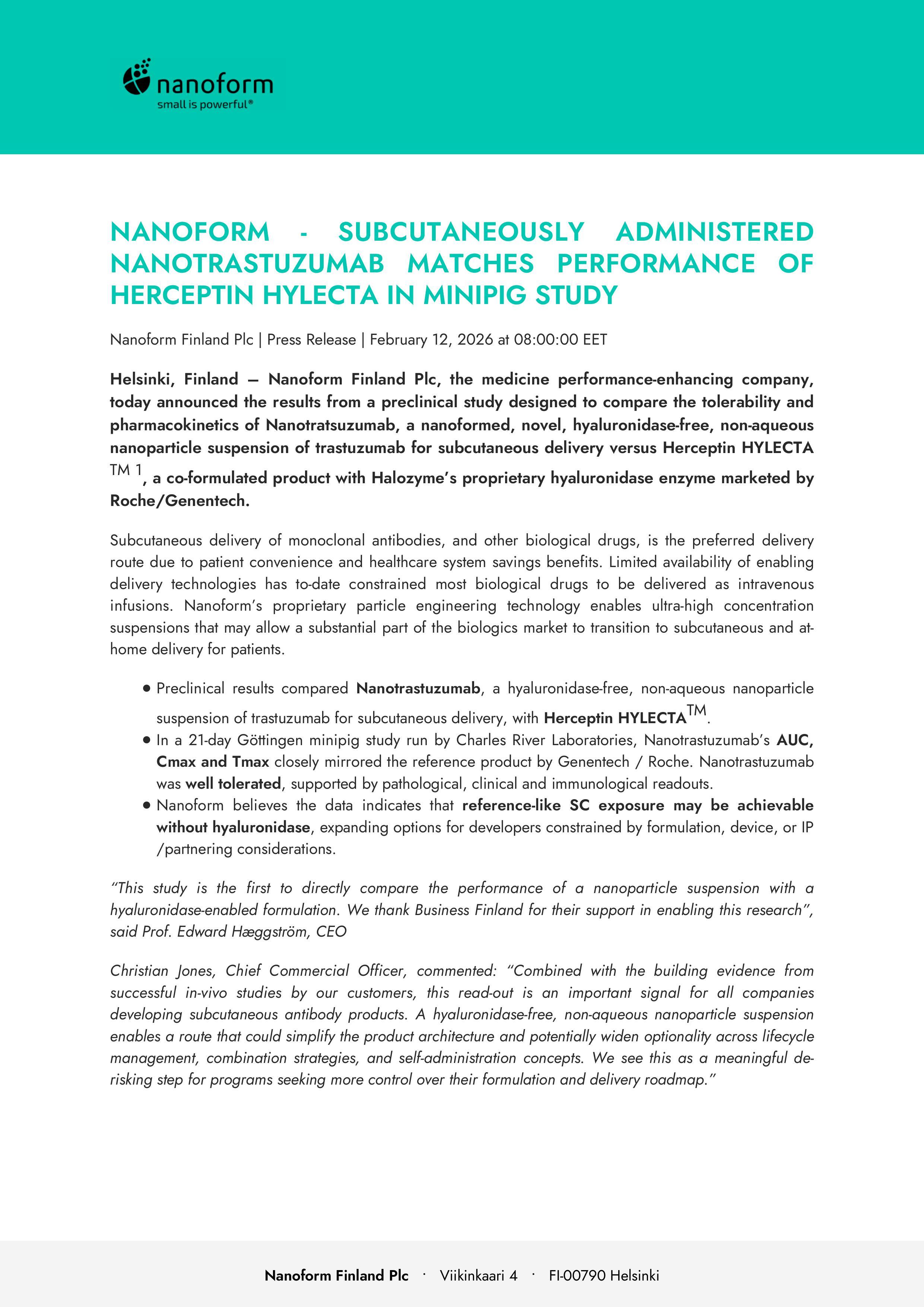Nanoform Finland Plc, the medicine performance-enhancing company, today announced the results from a preclinical study designed to compare the tolerability and pharmacokinetics of Nanotratsuzumab, a nanoformed, novel, hyaluronidase-free, non-aqueous nanoparticle suspension of trastuzumab for subcutaneous delivery versus Herceptin HYLECTA TM 1, a co-formulated product with Halozyme’s proprietary hyaluronidase enzyme marketed by Roche/Genentech.