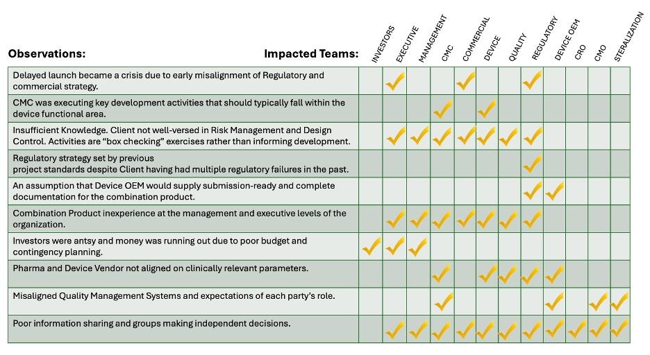 - Lack of cross-functional accountability: Including clear lines of communication and alignment on roles and responsibilities across the device team with other divisions of the company (CMC Project Management, Regulatory Affairs, Quality Assurance, etc.).