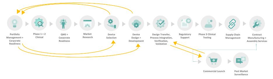 To manage the complexity of combination product development, we organize the work into seven interrelated (but not strictly linear) phases. This framework helps teams focus, align and identify critical touchpoints between functions.