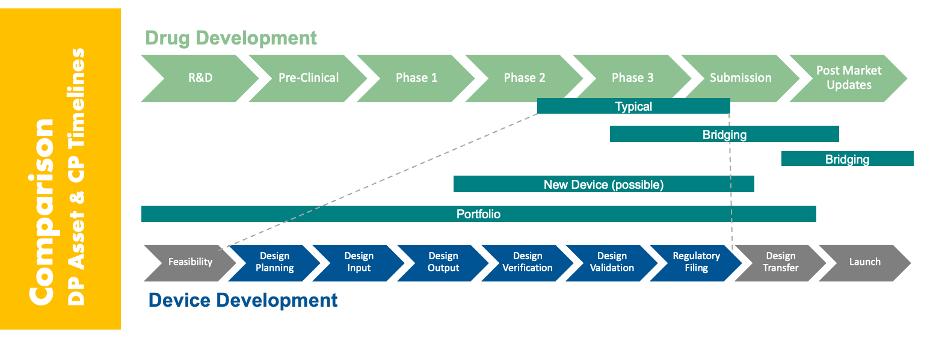 Combination products require integrating two very different development paradigms: the long, linear drug development timeline and the comparatively fast, iterative device development process. These paths must be coordinated in a way that satisfies regulators and drives commercial success, without creating delays or redundancy.
